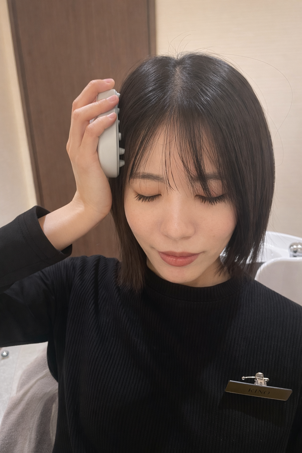 頭頂部上の真ん中一線と耳上左右一線ずつの合計三線につけ、指の腹で全体に馴染ませるように揉み広げていきます☝️