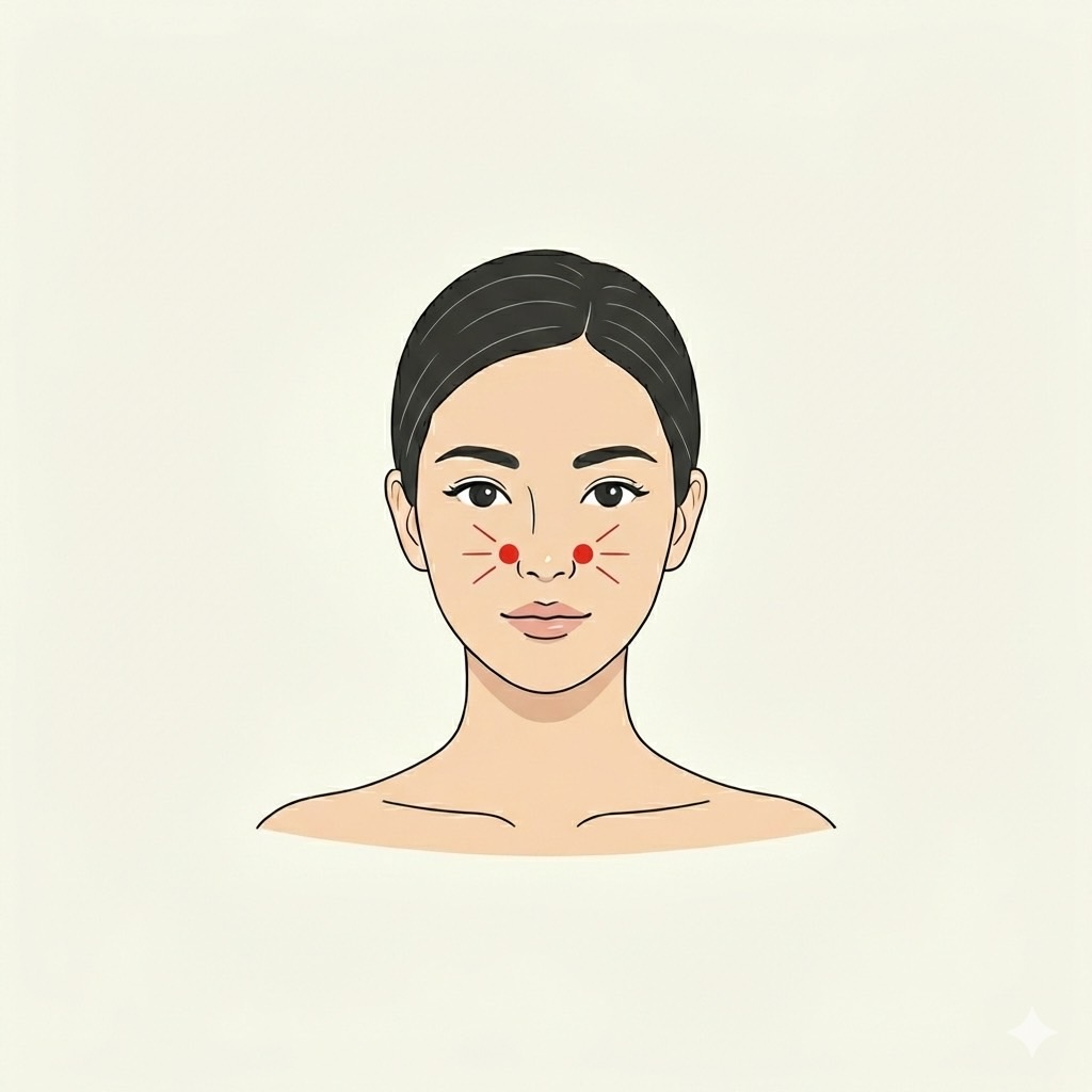 左右小鼻の上部のくぼみにあるツボで、くしゃみや鼻水を抑えてくれる機能があります。